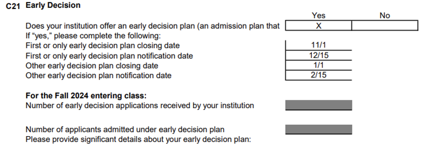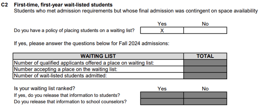 Most colleges and universities in the U.S. complete the , a standardized report designed to give organizations like U.S. News & World Report, the College Board, and Peterson’s consistent, reliable information for rankings and comparisons. The CDS covers a wide range of topics, but for our purposes, we’re going to zoom in on one specific section of : Section C, or first-time, first-year admissions.